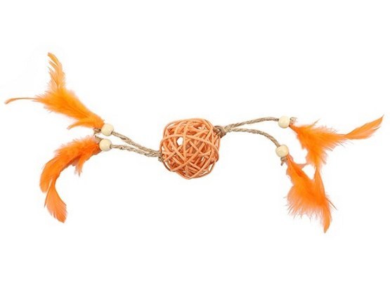 Zabawka dla kotów w kształcie piłeczki, wykonana z wikliny, naturalnych sznurków, drewnianych koralików oraz piór.