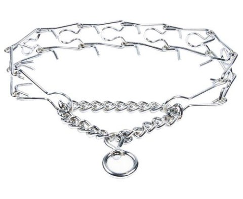 Popularna obroża typu "kolczatka", o budowie łańcuszka, którego ogniwa zakończone są wystającymi, tępo zakończonymi końcami drutu.