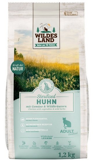 Sucha karma Wildes Land Sterilised Huhn z warzywami i dzikimi ziołami jest odpowiednia dla dorosłych, wykastrowanych i otyłych kotów wszystkich ras.